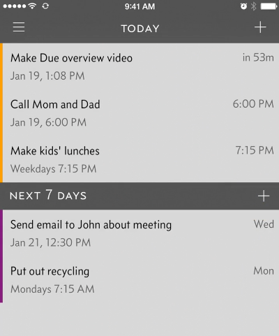I have Due set up to manage my morning and evening 'microtasks' - daily things that I know I need to do, but often forget. Boring things like making sure I clean out our cat litter box, lock the door when we head to bed, lay out my workout clothes for my morning run, that sort of thing.