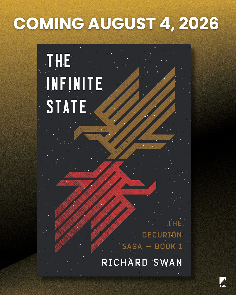 READING: I started reading Richard Swan's new SF novel THE INFINITE STATE (Bookshop.org, Waterstones, Amazon) last night (US cover and release date below as I don't believe the UK cover has been revealed yet) and it's cracking so far.